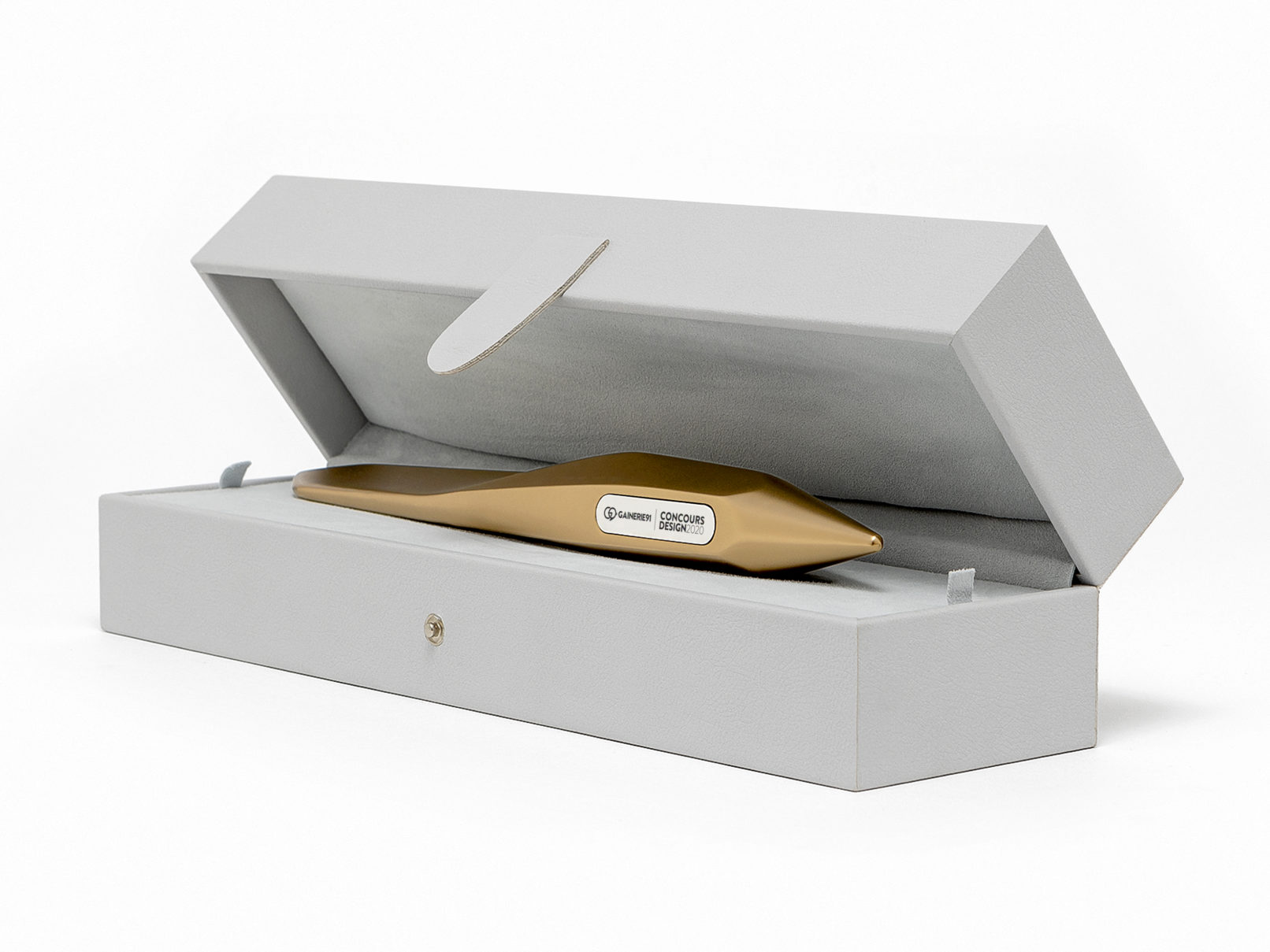 Gainerie 91 group offers world-renowned expertise in packaging and merchandising fields for the most prestigious luxury brands. This trophy rewards the winners of the design contest organized every year by the group. Expressing the creation process of a precious case, its shape is a crossover between the designer’s pencil and the sheather’s bone folder.